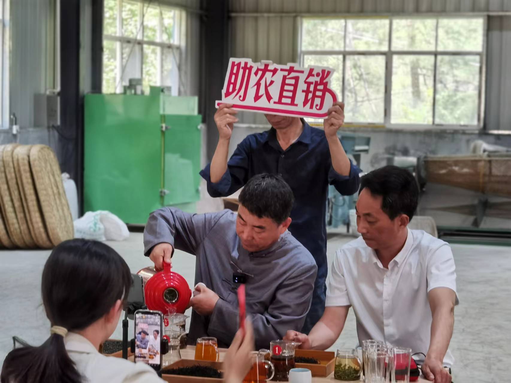 5月7日上午,安徽天方茶葉集團董事長鄭孝和先生一行受邀來到西河村集體茶廠云谷茶廠,介紹了天方茶葉集團助農網上直銷茶葉方法和經驗,并對云谷茶廠網上直銷茶葉進行了培訓和指導。上午11點,云谷茶廠室內抖音直播銷售平臺正式上線,西河村駐村第一書記汪令富、村委負責人李運生同天方集團董事長鄭孝和帶著西河村生產的江北高山紅茶—天柱紅走進直播間,向網友們在線介紹了天柱紅的種植、采摘、品質鑒別,經過一個多小時的直播推介,銷售天柱紅紅茶近六千元。下午2點,網上直播助農直銷茶葉活動改在茶園進行,通過實地高山茶園宣傳推介云谷茶廠生產的優質天柱紅紅茶和天柱玄月綠茶。