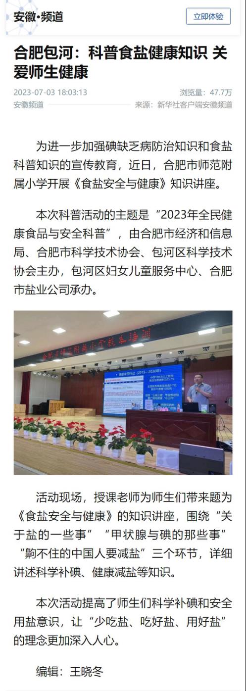 為切實做好黨的二十大精神宣傳貫徹工作,在習近平新時代中國特色社會主義思想指引下 ,進一步樹牢以人民健康為中心的發展思想,合肥鹽業在合肥市師范附屬小學開展食鹽科普活動,為全校200余名師生普及科學補碘、健康減鹽知識,關愛師生健康,推廣中鹽低鈉鹽,助力健康中國建設,食鹽健康科普活動得到新華社客戶端安徽頻道關注報道,截至發稿日總瀏覽量達47.7萬次。