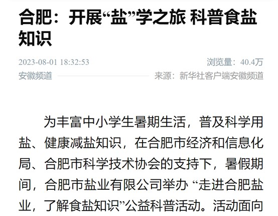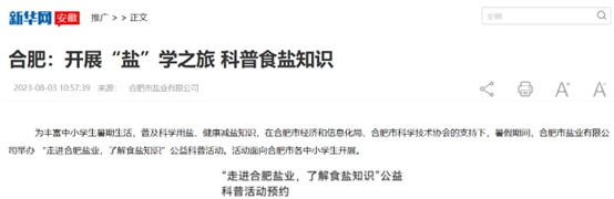 2023年7月,合肥鹽業(yè)自1950年成立以來首次對(duì)外開放,面向全市中小學(xué)生,開展“鹽”學(xué)之旅,食鹽科普游活動(dòng),活動(dòng)內(nèi)容包括參觀60年歷史的鐵路專用線、省市食鹽儲(chǔ)備倉(cāng)庫(kù),食鹽健康科普講座,7月份接待來自國(guó)內(nèi)外7所中小學(xué)校170名學(xué)生和家長(zhǎng),8月份已預(yù)約8場(chǎng)食鹽科普游。